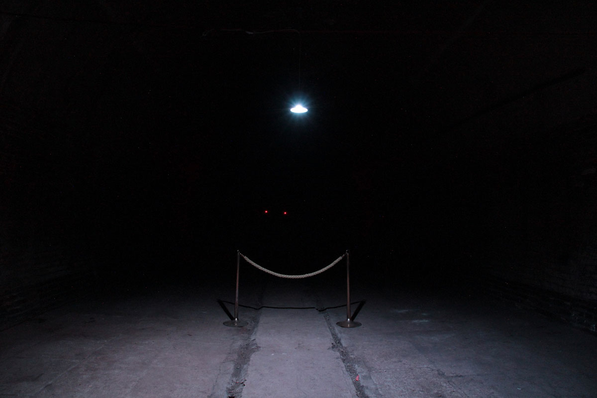 Barely any air enters the former fermentation and storage cellars of the Berliner Kindl Brewery – daylight even less so. An abandoned, secluded place governed by emptiness and stale darkness. Down there, deep underground, where no phone signal reaches and calls go unheard, nobody stays for long. Visitors enter a pitch-black room. A hanging lamp emits blue light that barely lifts the gloom, weakly illuminating a barrier tape. A space like outer space, in which the individual indicator lights of amplifiers glow. Into this solitary darkness fall words, sentence fragments, single voices, cello sounds and ambient noise. Lost, yet strangely familiar – as if trying to convince us that a human being inhabits this place, that life is possible here. Text and sound, amplified by the long reverberation and the apparent endlessness of the dark, take on a heightened intensity of meaning.