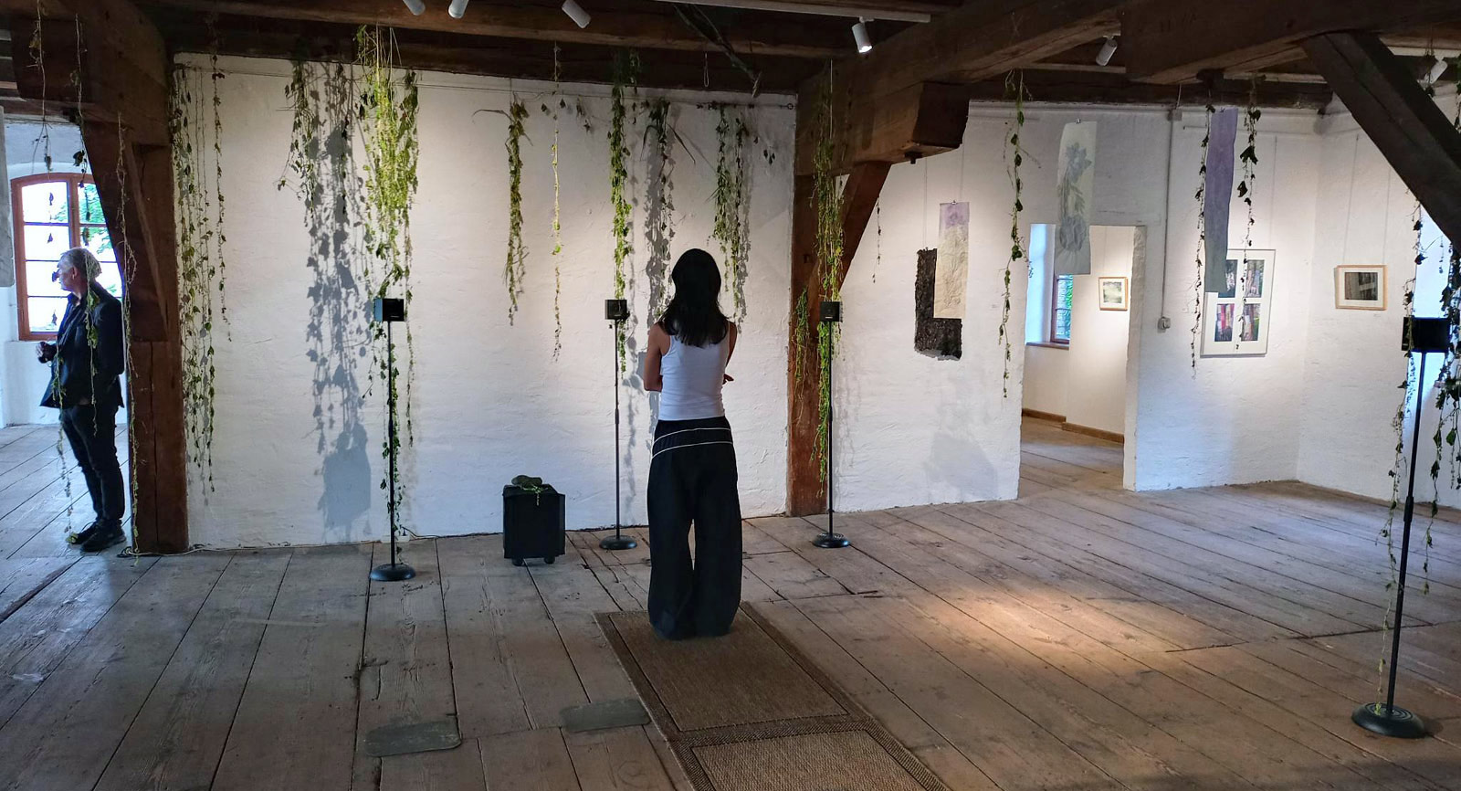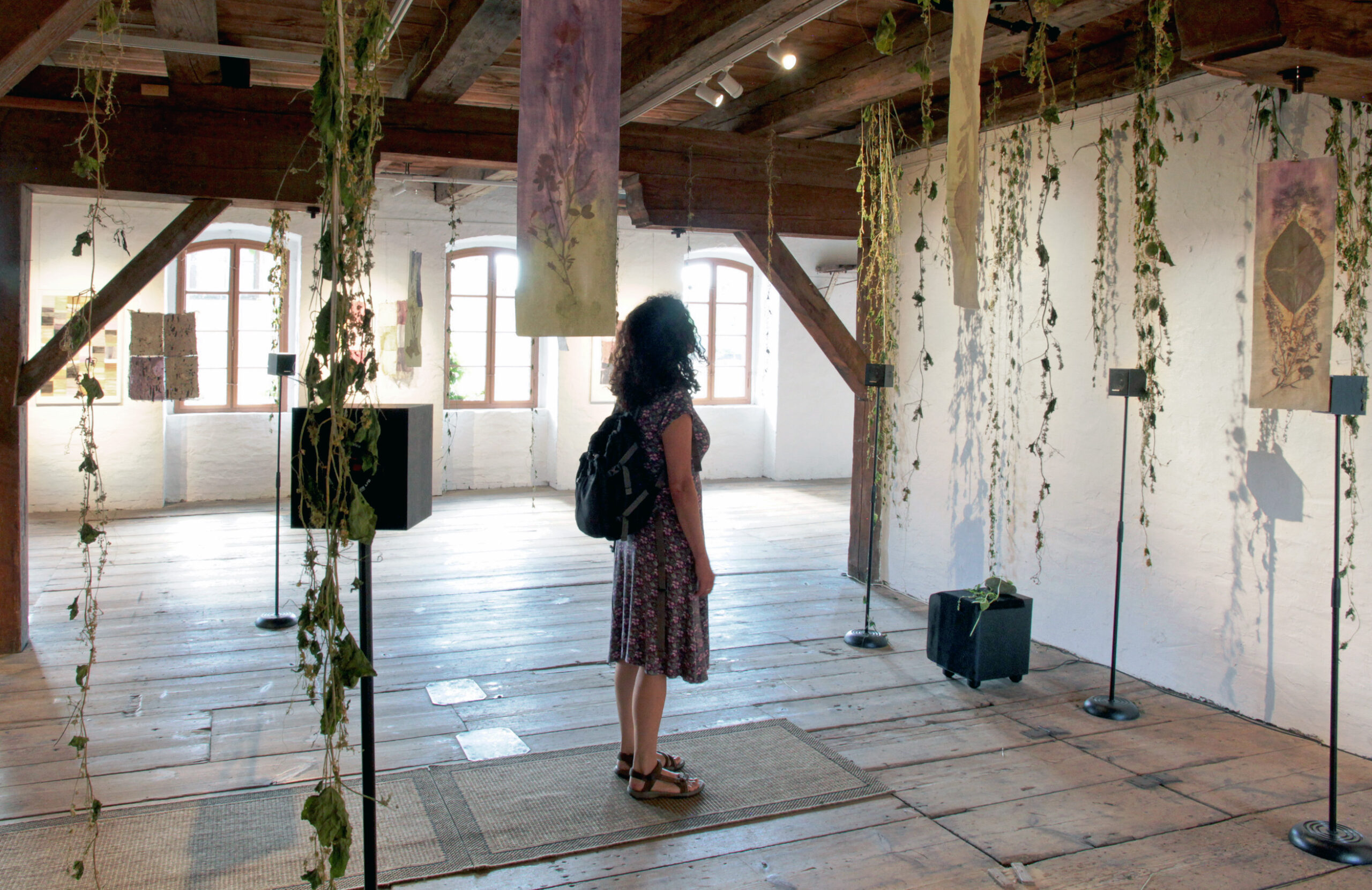 Bird calls, gusts of wind across reed beds, the distant glide of water, the breathing expanse of the river meadows between the banks. More than 60 open-field recordings form the basis of this interactive work. The enveloping sounds were neither curated nor aesthetically processed, but left in their original logic – as fragile acoustic traces of what reveals itself in the moment of listening, and retreats again just as quickly. The installation translates this experience into the exhibition space. Five loudspeakers form a circular listening zone at whose centre the sonic panorama unfolds. The sound fragments are triggered by the movements of visitors and played back in random sequence – a shifting texture of proximity and distance that connects the room with the atmospheric openness of the floodplain landscape. Invasive climbing plants from the national park, hung to dry from the wooden beam ceiling of the historic tobacco warehouse, complete the installation and enrich the multisensory experience with their scent.